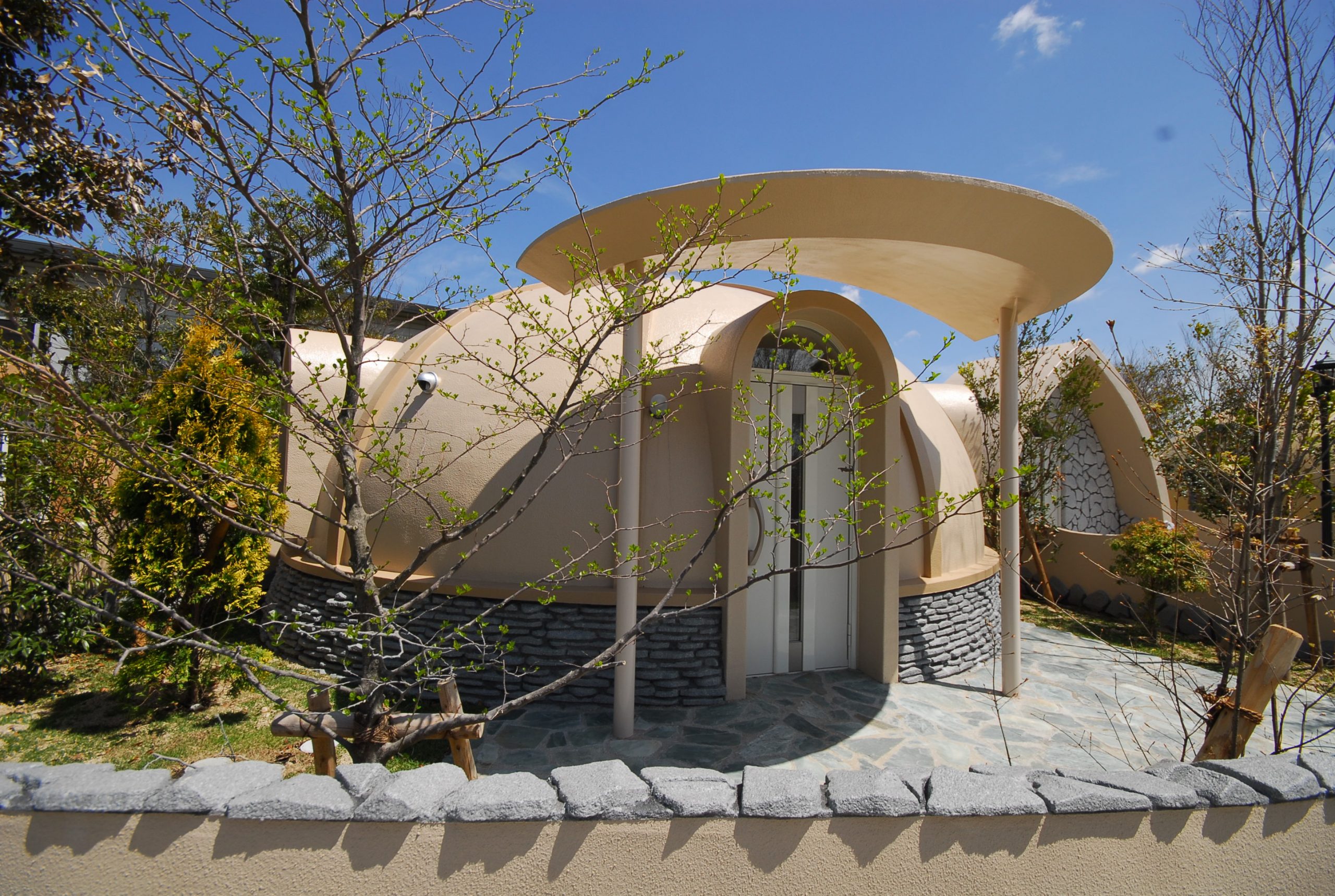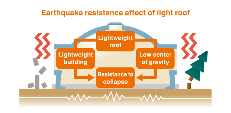 The Dome House, due to its lightweight design and low center of gravity, is less likely to collapse than regular buildings. Its simple structure with no columns prevents roof cave-in, ensuring safety even in heavy tremors.